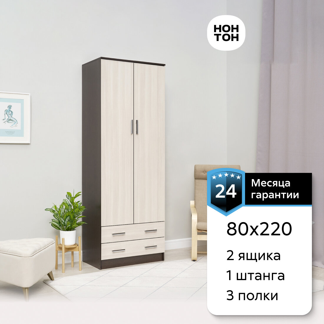 Шкаф Эра Дуэт платяной, ЛДСП, 2 ящика, штанга, 80 х 220 х 48,7 см, ясень шимо ПЭ1049