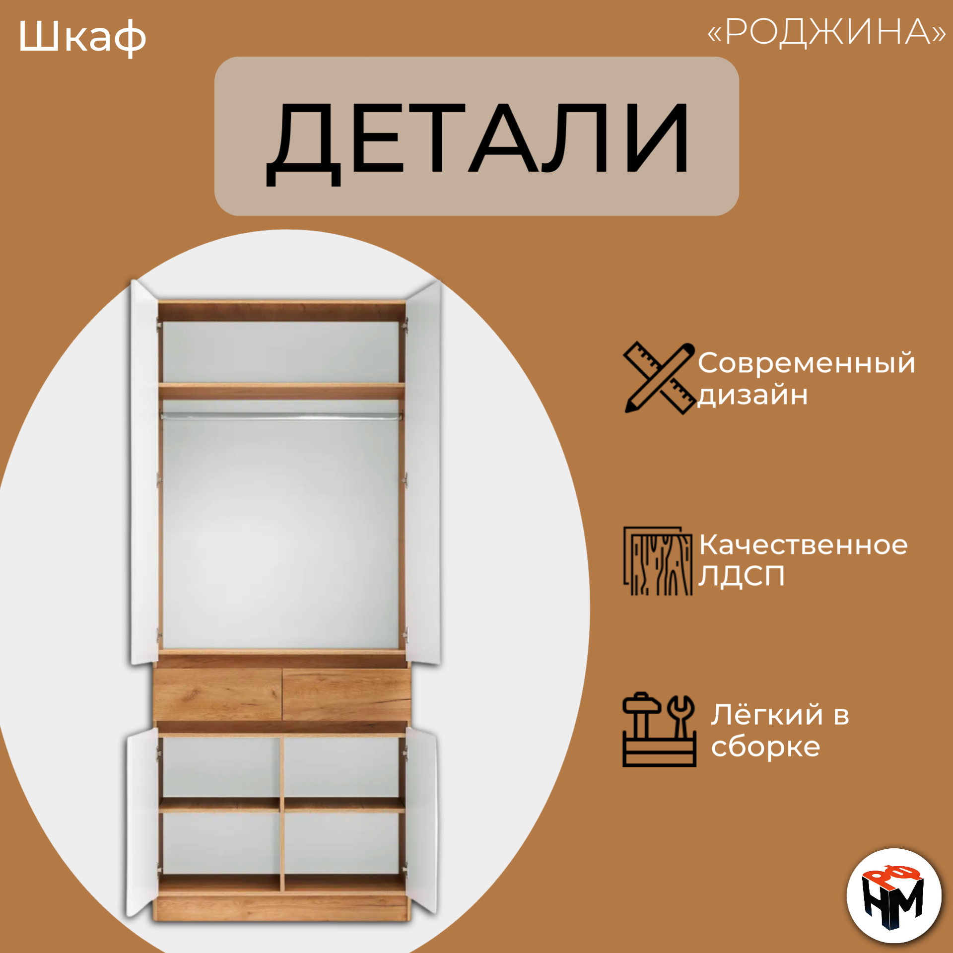 Прихожая Роджина Шкаф 4-х ств распашной Дуб крафт, Белый глянец/Шкаф для одежды с ящиками и штангой