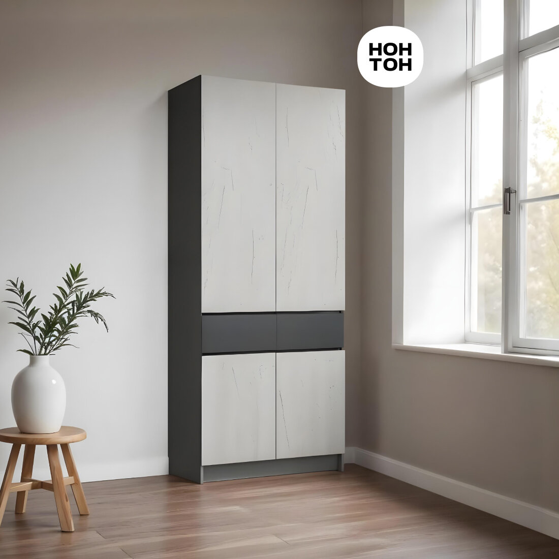 Высокий шкаф с ящиками для одежды Миф Роджина четырехстворчатый графит/ дуб крафт белый , размер 2000х520х2400мм