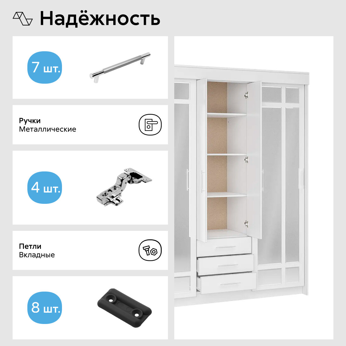 | Комплектация | Шкаф 1 шт. В центральной части — три вместительных ящика, над ними отделение с распашной дверцей и несколькими полочками. |