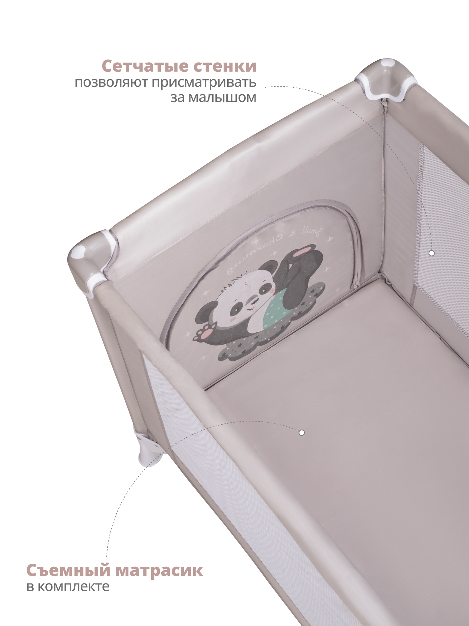 | Особенности | боковой лаз / можно использовать с рождения / мягкие бортики / с колесами / складной / стенки из ткани/сетки / фиксаторы колес |