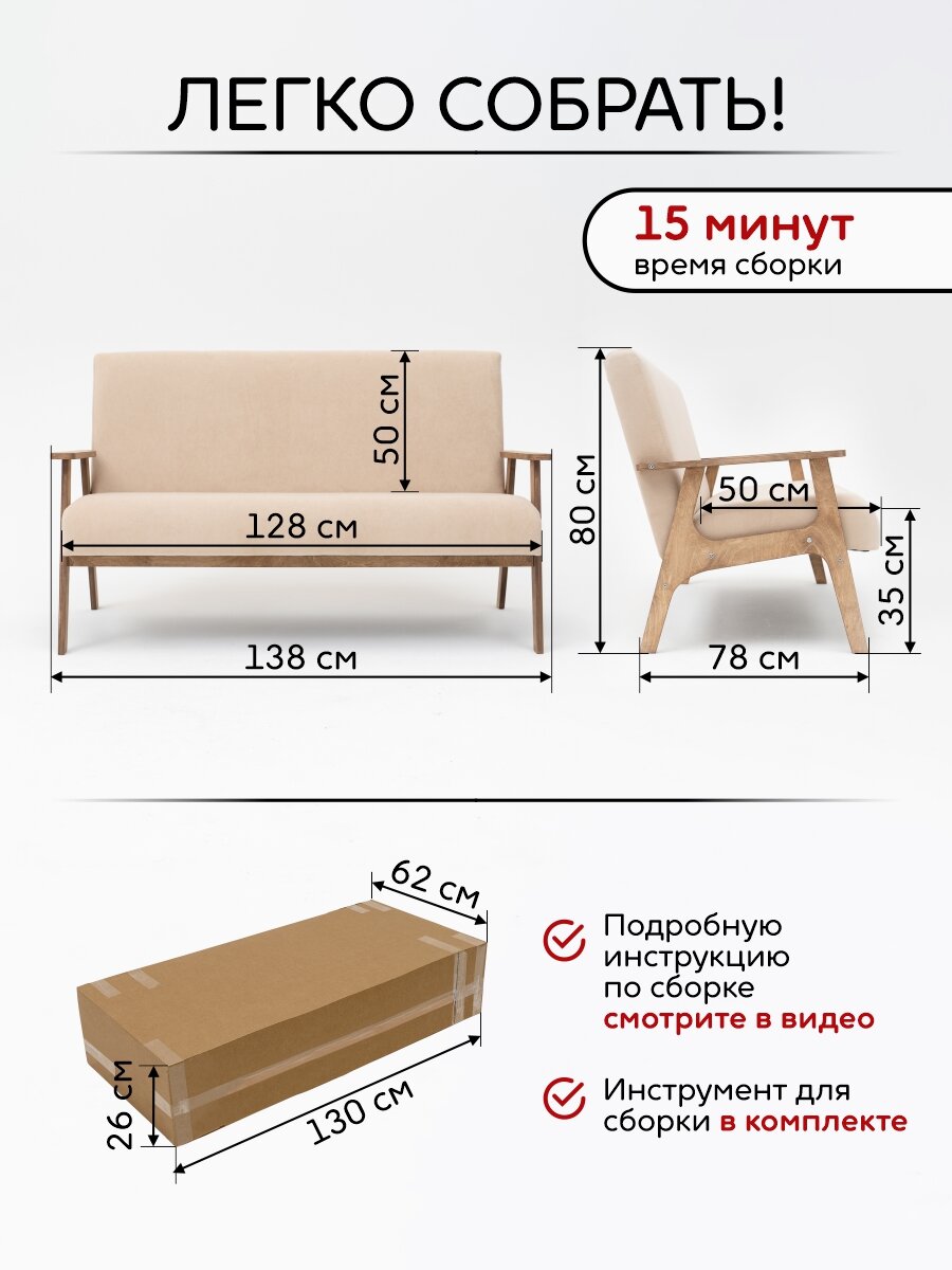 Диван ZASIDELIS релакс прямой на кухни, темно бежевый/натуральный, из велюра, 75x138x82 до 200 кг
