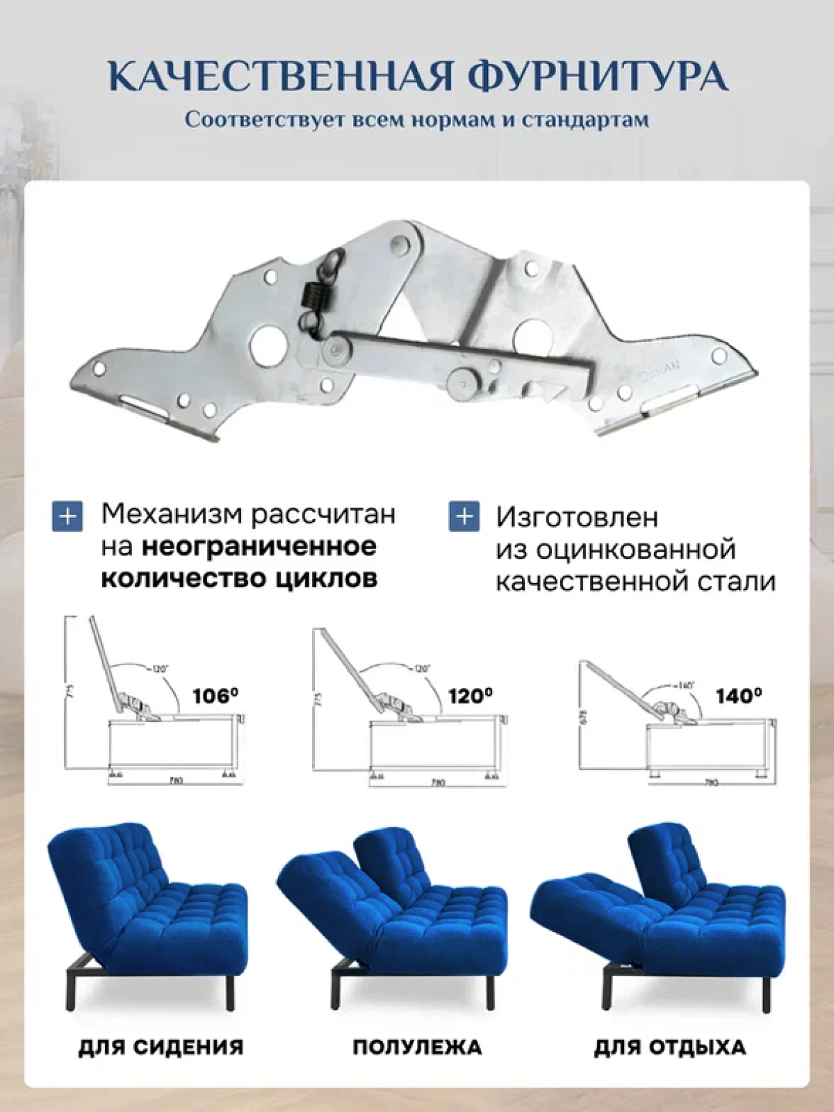 | Дополнительная информация | двойная спинка с 3 положениями: вертикальное, релакс, горизонтальное; материал: антивандальный велюр |