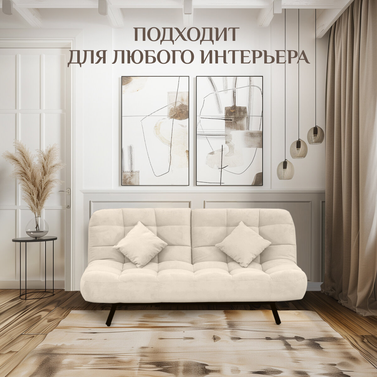Диван-кровать Brendoss 304, прямой диван раскладной с двойной спинкой лофт, механизм клик-кляк, материал антивандальный велюр, бежевый