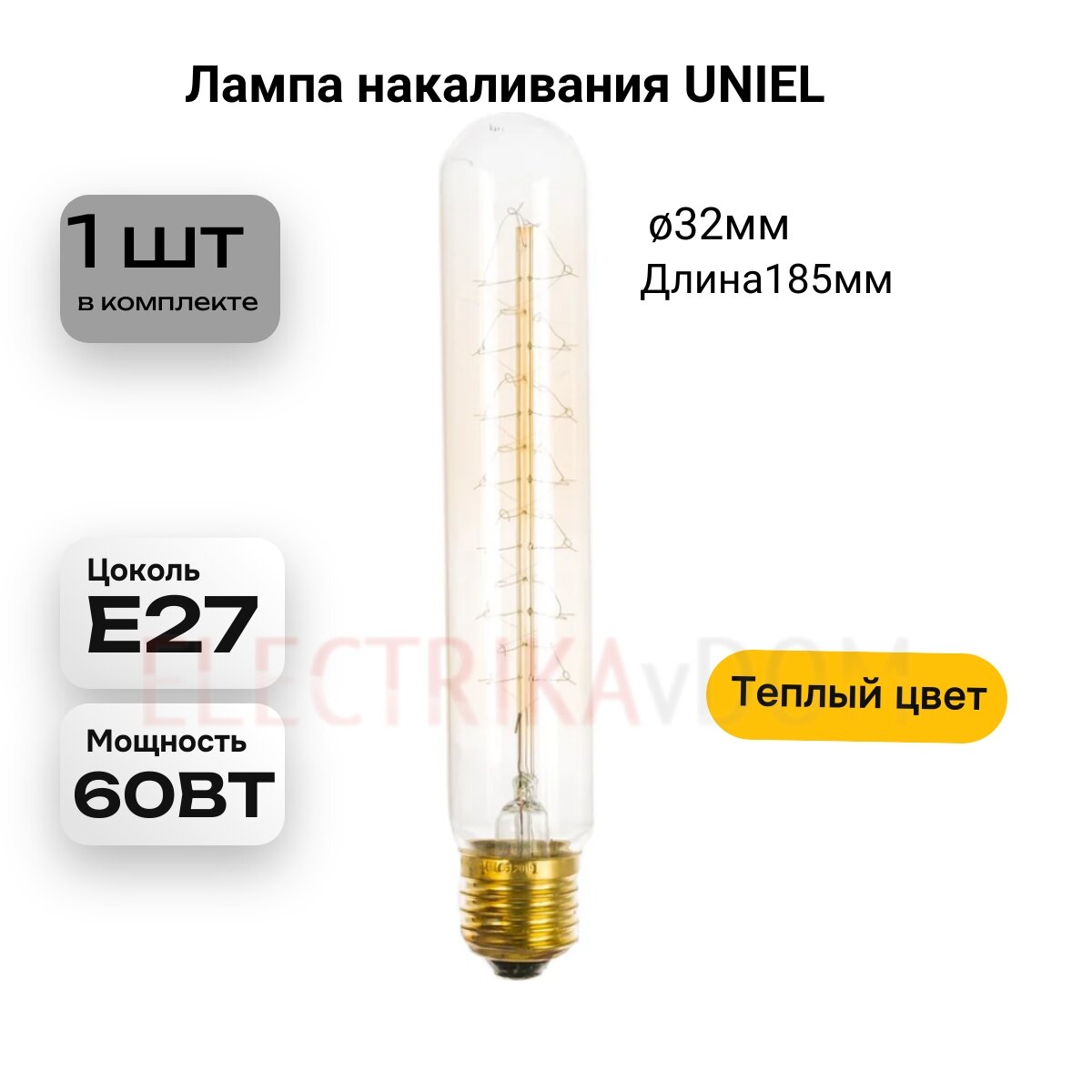IL-V-L32A-60-GOLDEN-E27 CW01 Лампа накаливания Vintage. Форма цилиндр. длина 185 мм. Форма нити CW. Картон. ТМ Uniel интересное: