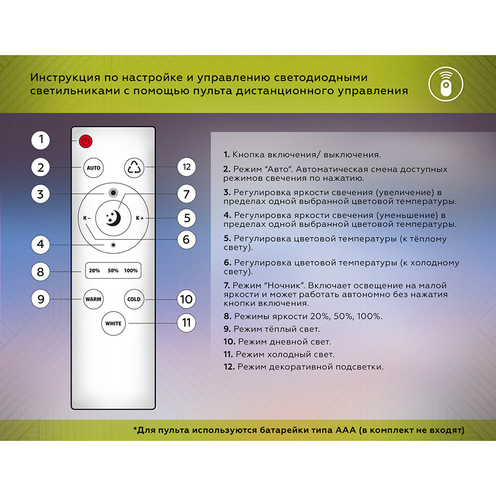 | Управление | механическое / пульт дистанционного управления / регулировка яркости диммером / управление со смартфона |