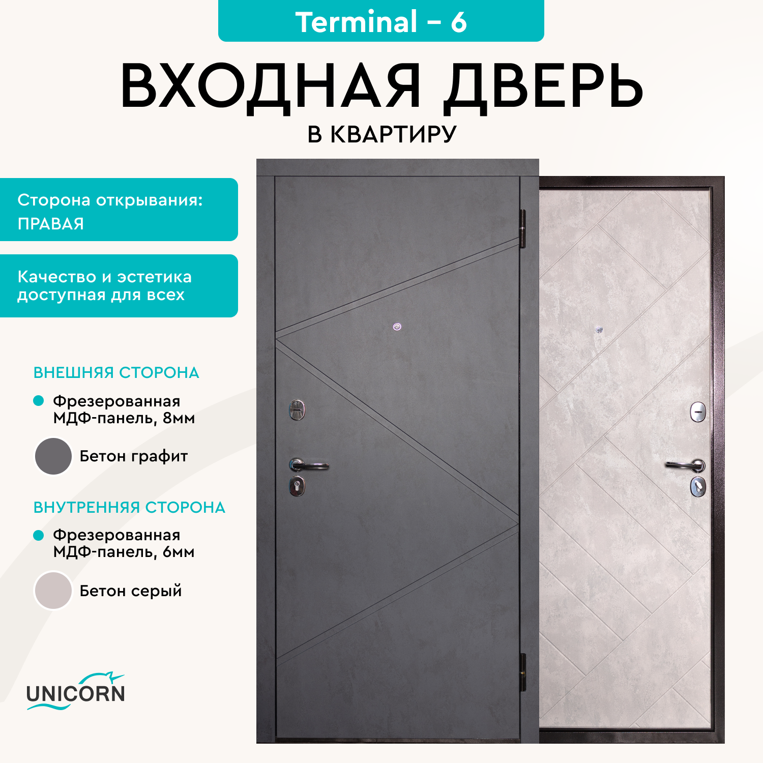 Купить Дверь входная металлическая в квартиру Unicorn Terminal-6 860х2050 правая, антивандальное покрытие, уплотнитель, цилиндровый замок