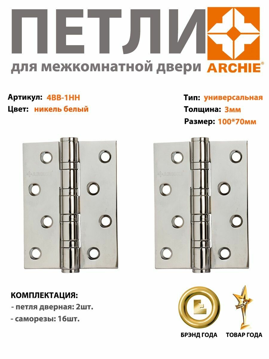 Петля дверная универсальная Archie A010-C 100X70X3-4BB-1HH, бел. никель, 4 ш/подшипника, 1шт