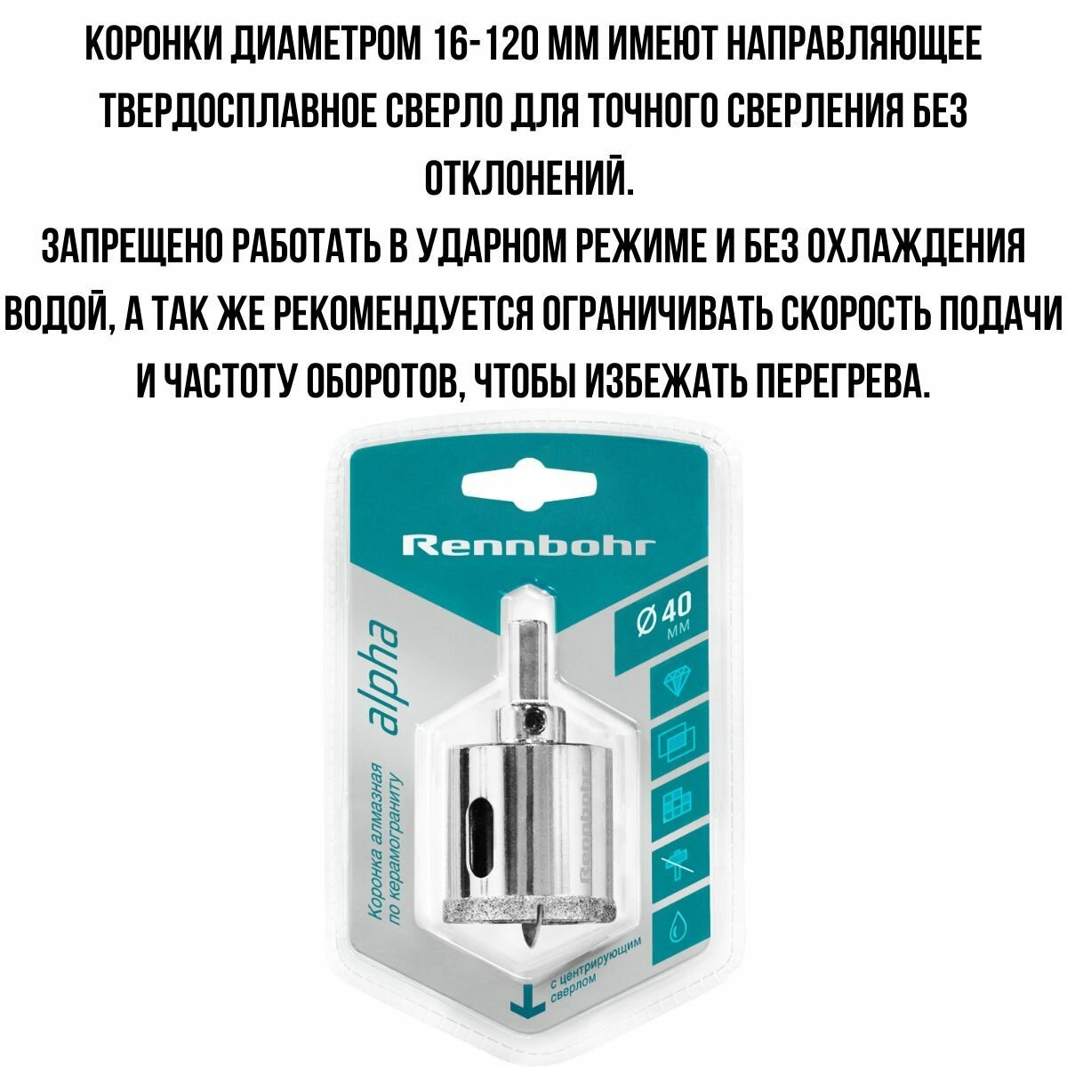 | Дополнительная информация | Коронка алмазная RENNBOHR 25мм с центрирующим сверлом |