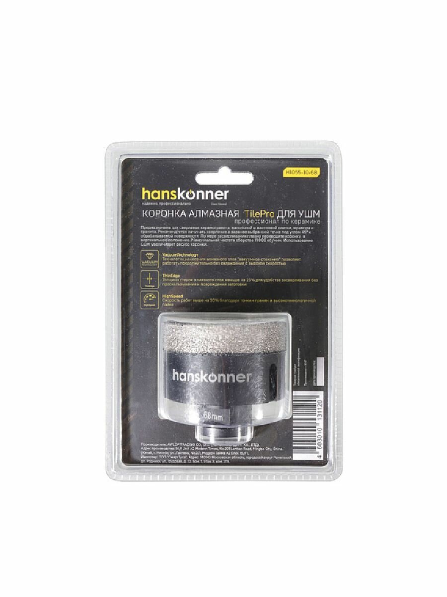 Коронка алмазная для УШМ, TilePro, 68 мм, вакуумн. спекание алмазов, Hanskonner, H1055-10-68