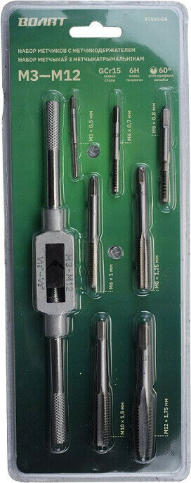 | Подробная комплектация | Метчики М3x0,5 мм, М4x0,7 мм, М5x0,8 мм, М6x1 мм, М8x1,25 мм, М10x1,5 мм, М12x1,75 мм; Метчикодержатель |