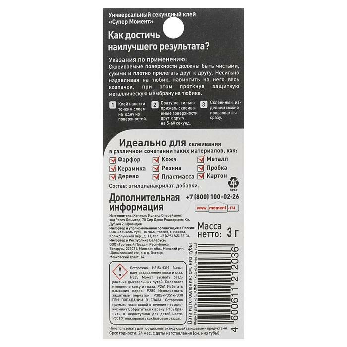 | Дополнительная информация | состав: этилцианакрилат, добавки; теплостойкость клеевого шва: от -40 до 70 ºC; плотность: около 1,05 г/см³; не пригоден для склеивания полипропилена, полиэтилена, политетрафторэтилена (тефлона), стекла, глазированных поверхностей и силиконовой резины; также не пригоден для склеивания очень мягкой кожи; никогда не применяйте клей для склеивания посуды, в которую будет наливаться горячая жидкость |