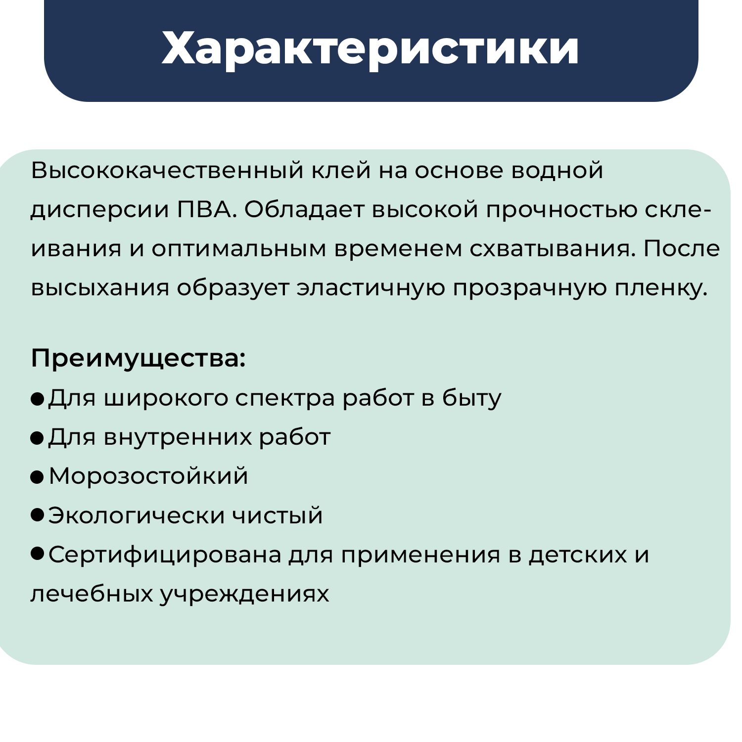 | Свойства | водостойкий / моментальный / морозостойкий / прозрачный / термостойкий |