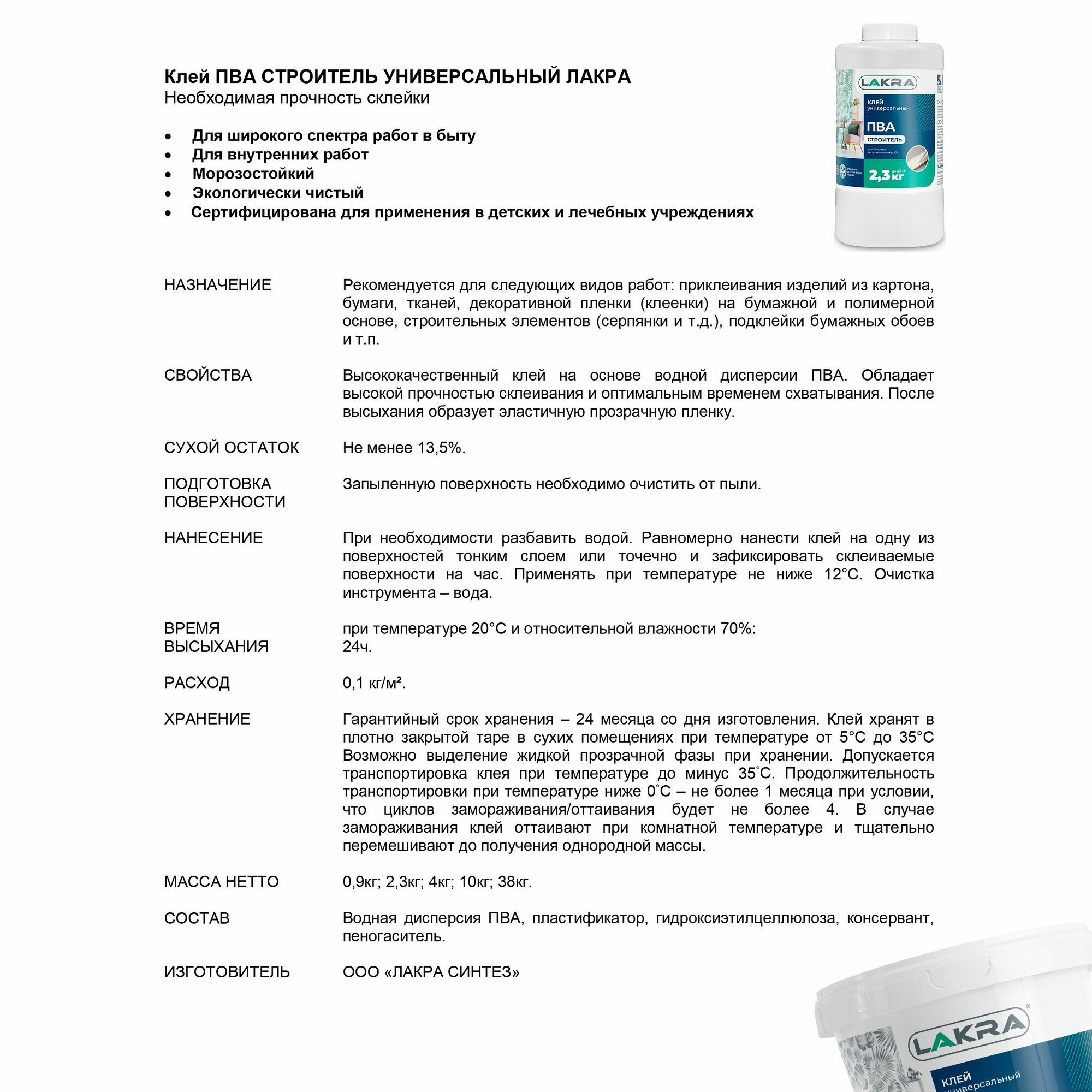 Клей ПВА Лакра Строитель, 2.3 кг, 2.3 л