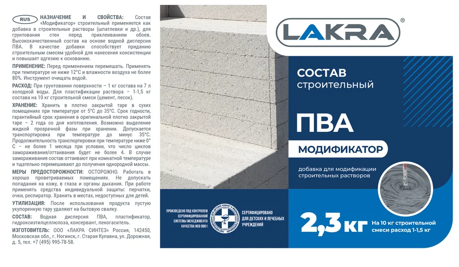 СохранитьСостав на основе ПВА Лакра "Модификатор" строительный 2,3кг Л-С интересное: