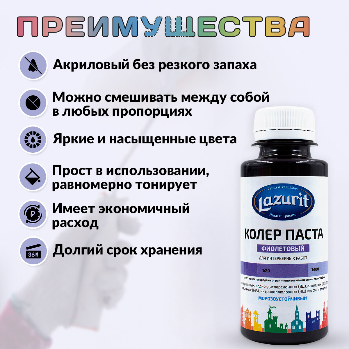 Ниже Вы можете прочитать отзывы на Колер универсальный (100мл) №20 фиолетовый Lazurit, ознакомится с подробными характеристиками, посмотреть интересные обзоры и фотографии на Колер универсальный (100мл) №20 фиолетовый Lazurit.