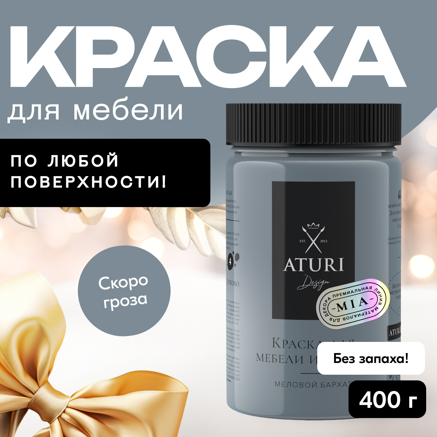 Купить Матовая краска для мебели 0,4 кг без запаха, меловая быстросохнущая мебельная Aturi Design Mia для декора, кухни и кухонных фасадов, дверей, пластика и металла. Цвет: Скоро гроза, темно серый
