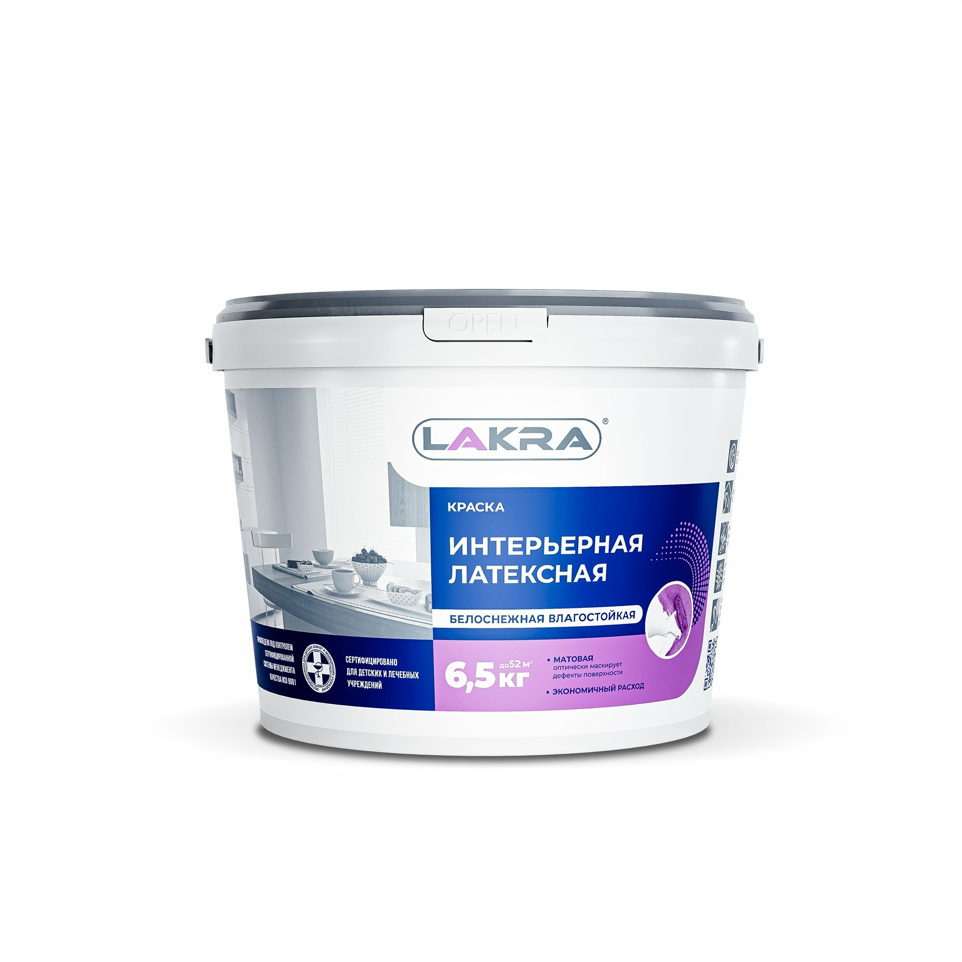 Краска интерьерная латексная влагостойкая Лакра белоснежная матовая, 6,5кг