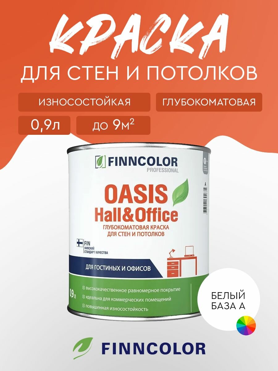 Finncolor Oasis Hall&Office моющаяся краска для стен и потолков (белая, матовая, база A, 0,9 л)
