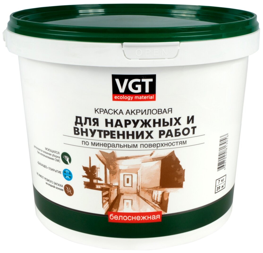 Краска по Минеральным Поверхностям VGT ВД-АК-1180 7кг Белоснежная, Моющаяся, Матовая для Наружных и Внутренних Работ / ВГТ Моющаяся.