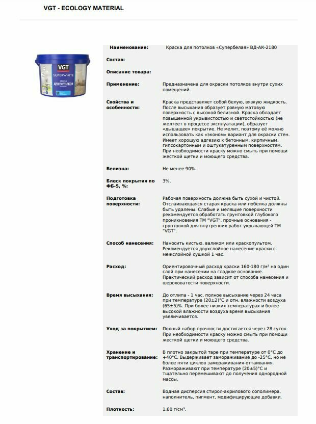 Ниже Вы можете прочитать отзывы на Краска VGT ВД-АК-1180 белоснежная моющаяся, для наружных и внутренних работ, матовая 7кг, ознакомится с подробными характеристиками, посмотреть интересные обзоры и фотографии на Краска VGT ВД-АК-1180 белоснежная моющаяся, для наружных и внутренних работ, матовая 7кг.