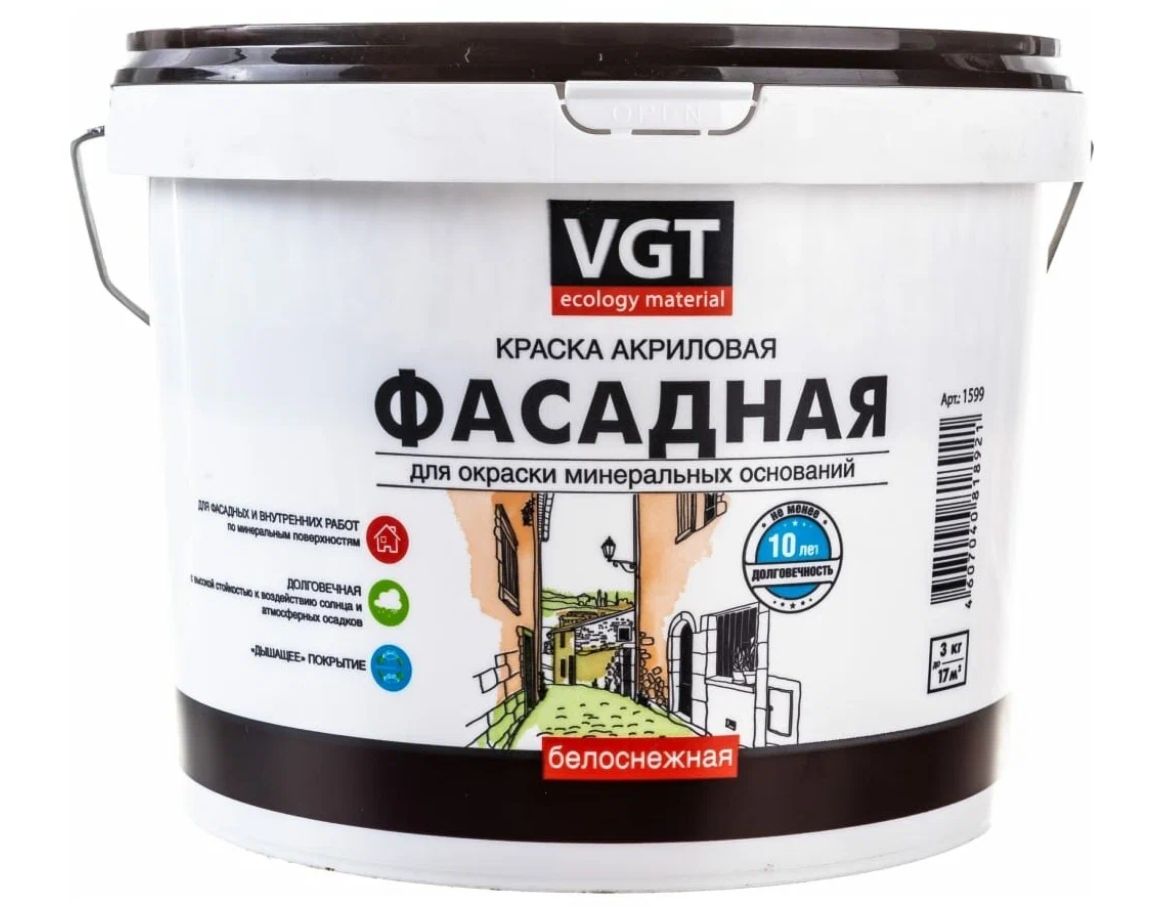 Краска акриловая фасадная ВД-АК-1180 VGT Белоснежная белая, матовая (3кг)