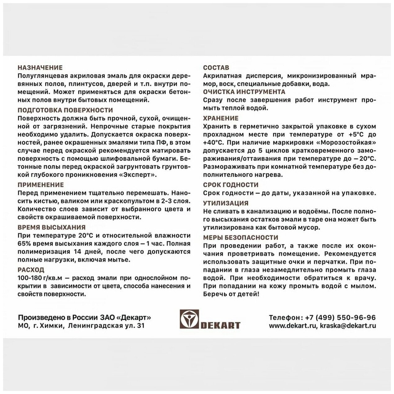 | Дополнительная информация | при температуре 20°С и относительной влажности 65% время высыхания каждого слоя – 2 часа; полная полимеризация – 14 дней, после чего допускаются полные нагрузки, включая мытье |