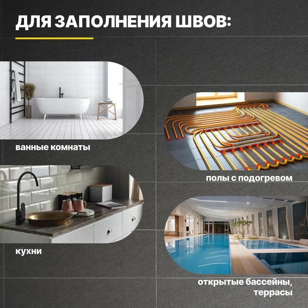 | Область применения | бассейны, для ванной комнаты, для внутренних работ, для затирки швов, для кухни, для наружных работ, для пола, для стен, для теплого пола, камины и печи, керамическая плитка, натуральный камень, террасы и балконы, фасад |