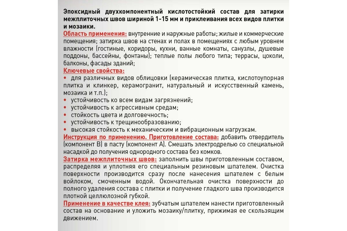| Область применения | бассейны, для ванной комнаты, для внутренних работ, для герметизации угловых швов и стыков, для затирки швов, для кухни, для наружных работ, для пола, для производственных помещений, для стен, для теплого пола, искусственный камень, керамическая плитка, керамогранит, клинкерная плитка, мозаика, натуральный камень, прозрачная и полупрозрачная плитка, террасы и балконы, фасад |