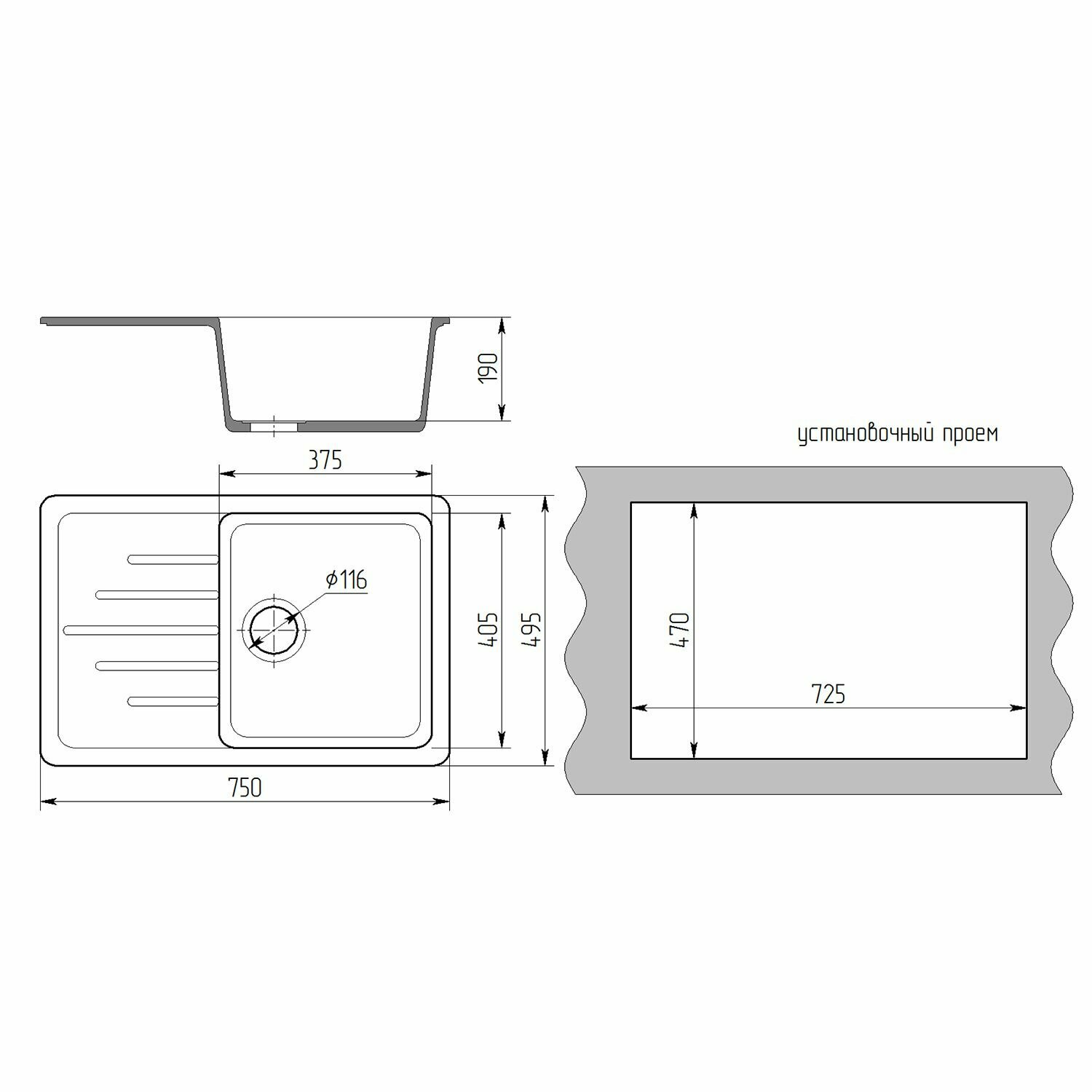 Мойка ML-GMS07 стандарт с крылом, светло-серый (310), 750*495*190мм