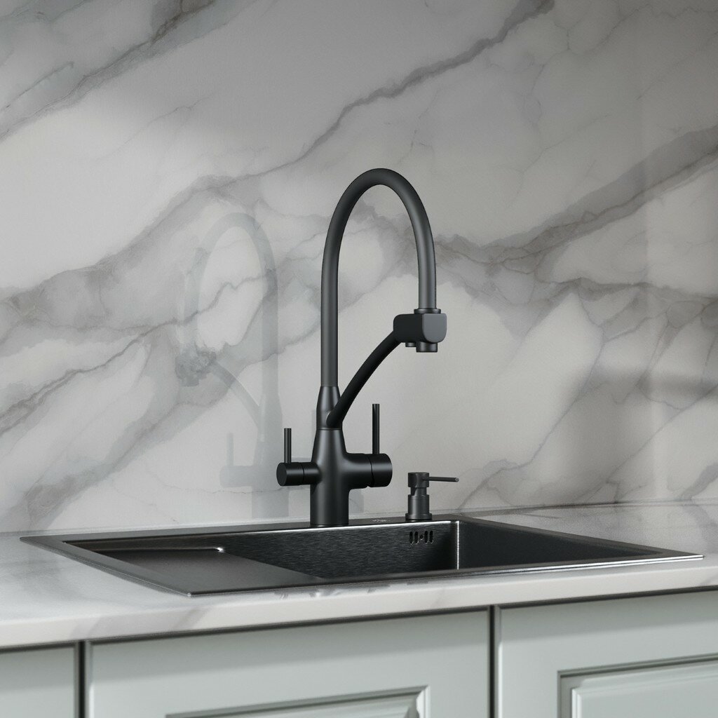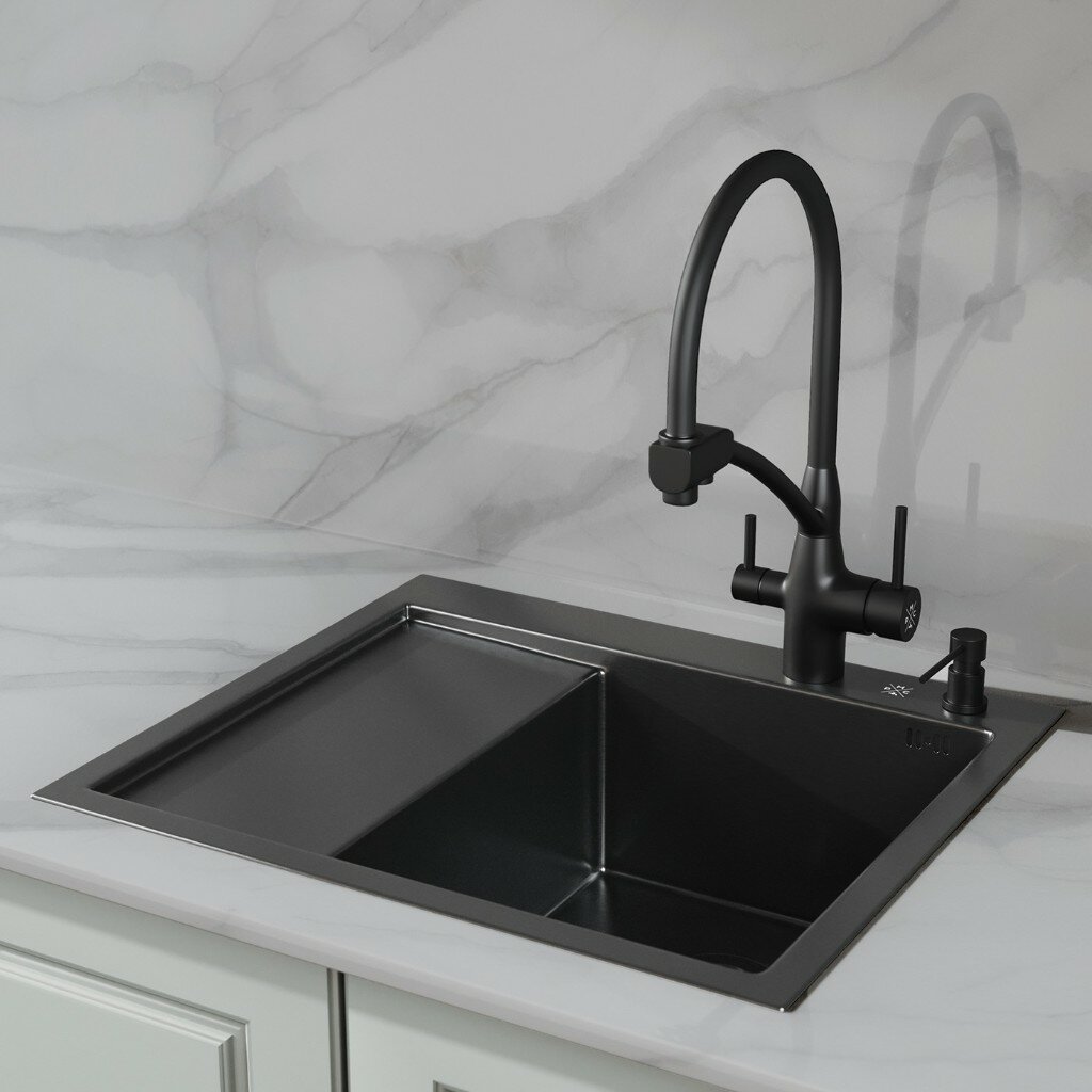 Кухонная мойка из нержавеющей стали, РМС MR-5843BL, дозатор, корзина раздвижная для сушки, сифон, PVD покрытие