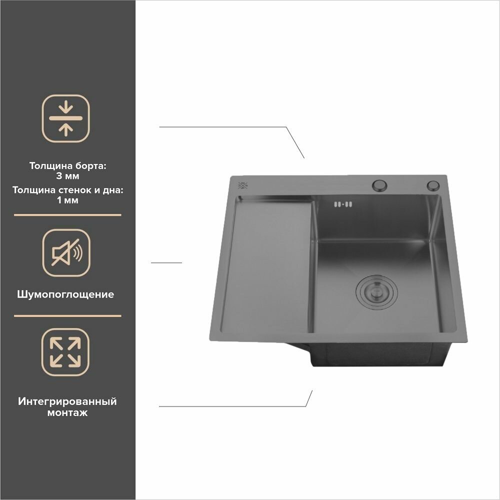 Кухонная мойка, РМС MRK-5851BL-L, нержавеющая сталь, с правым крылом, дозатор, сифон, гарантия