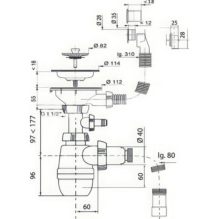 Сифон для мойки большая горловина с переливом, с отводом под сливной шланг и со съёмной корзинкой для мусора