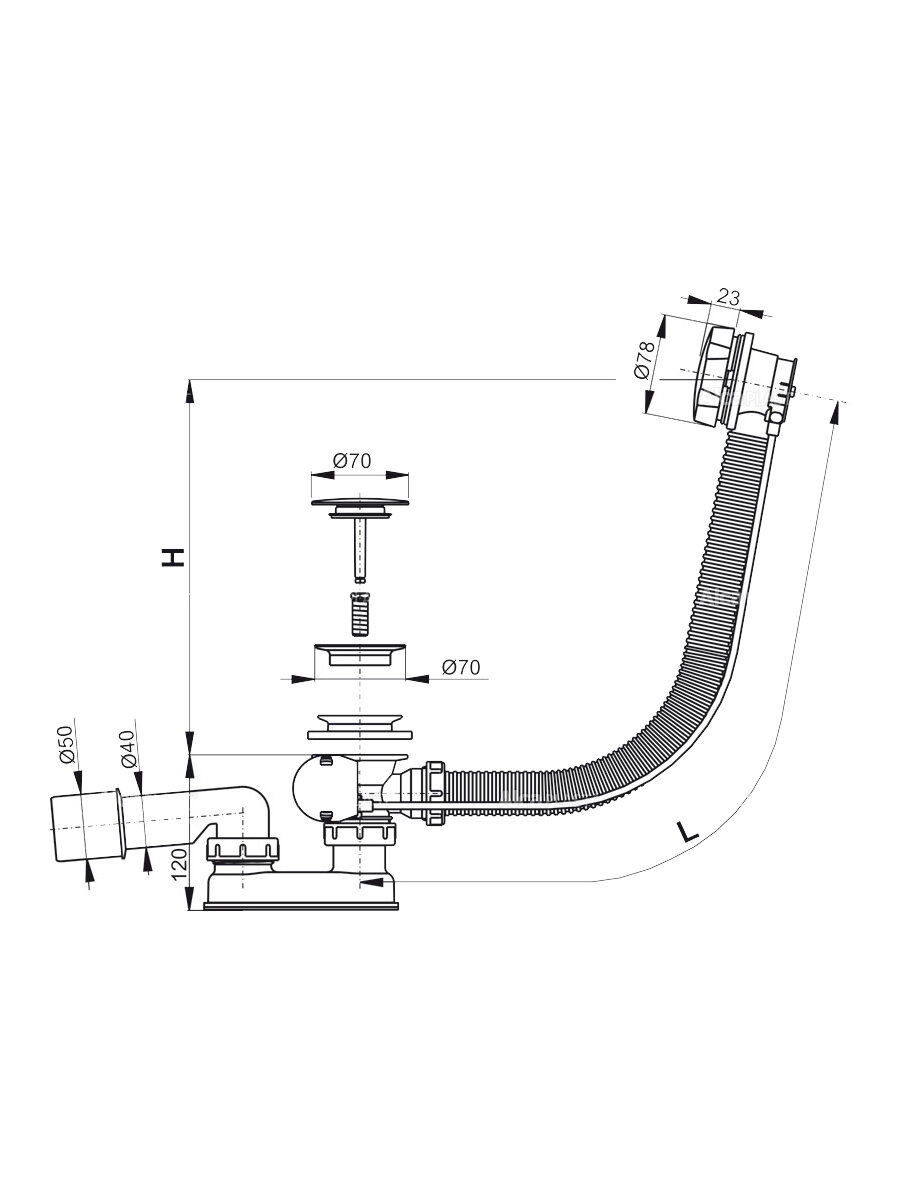 Сифон для ванны Alcadrain регулируемый полуавтомат с выпуском d70 мм с переливом (A55KM/AG210125260)