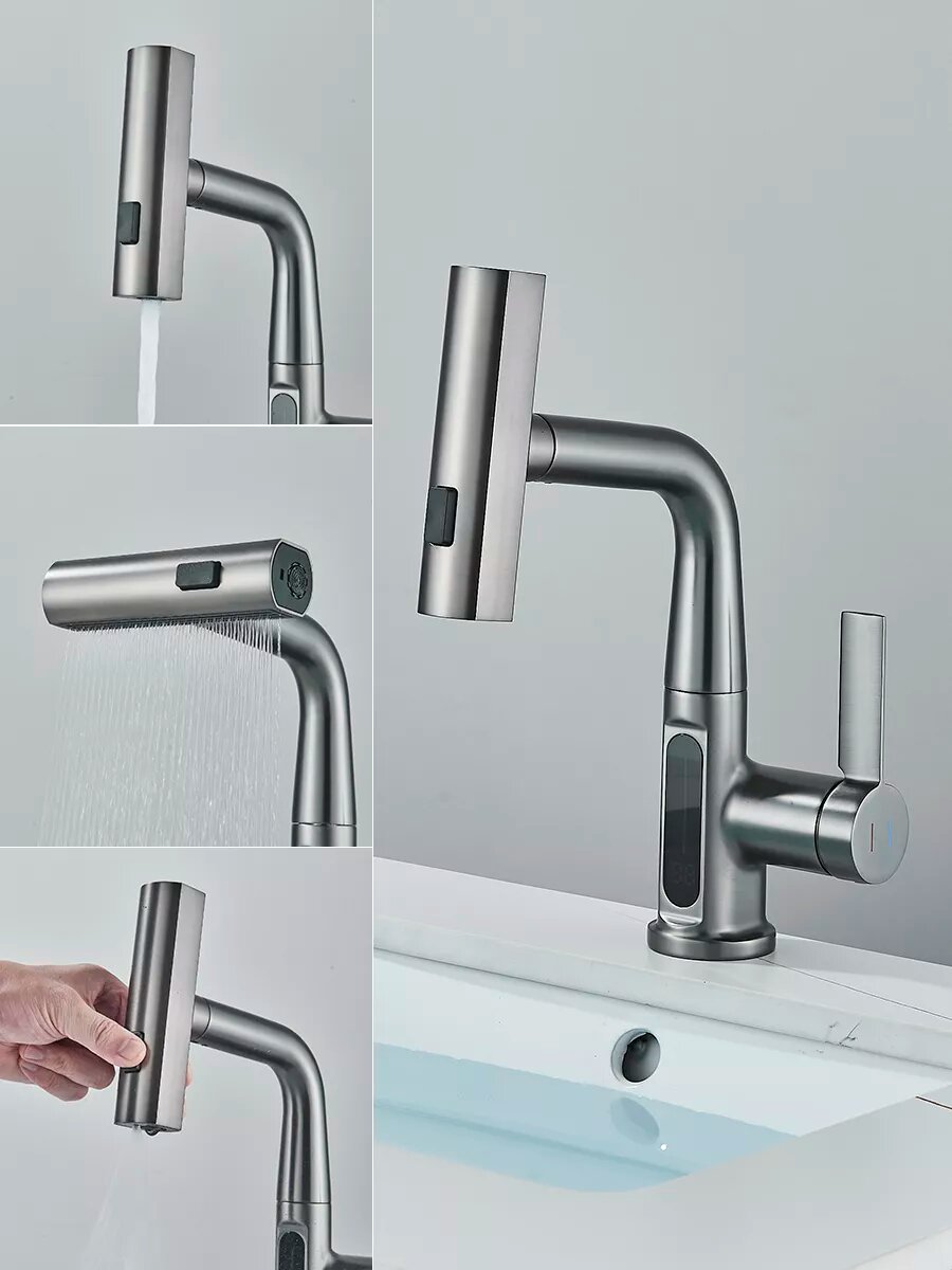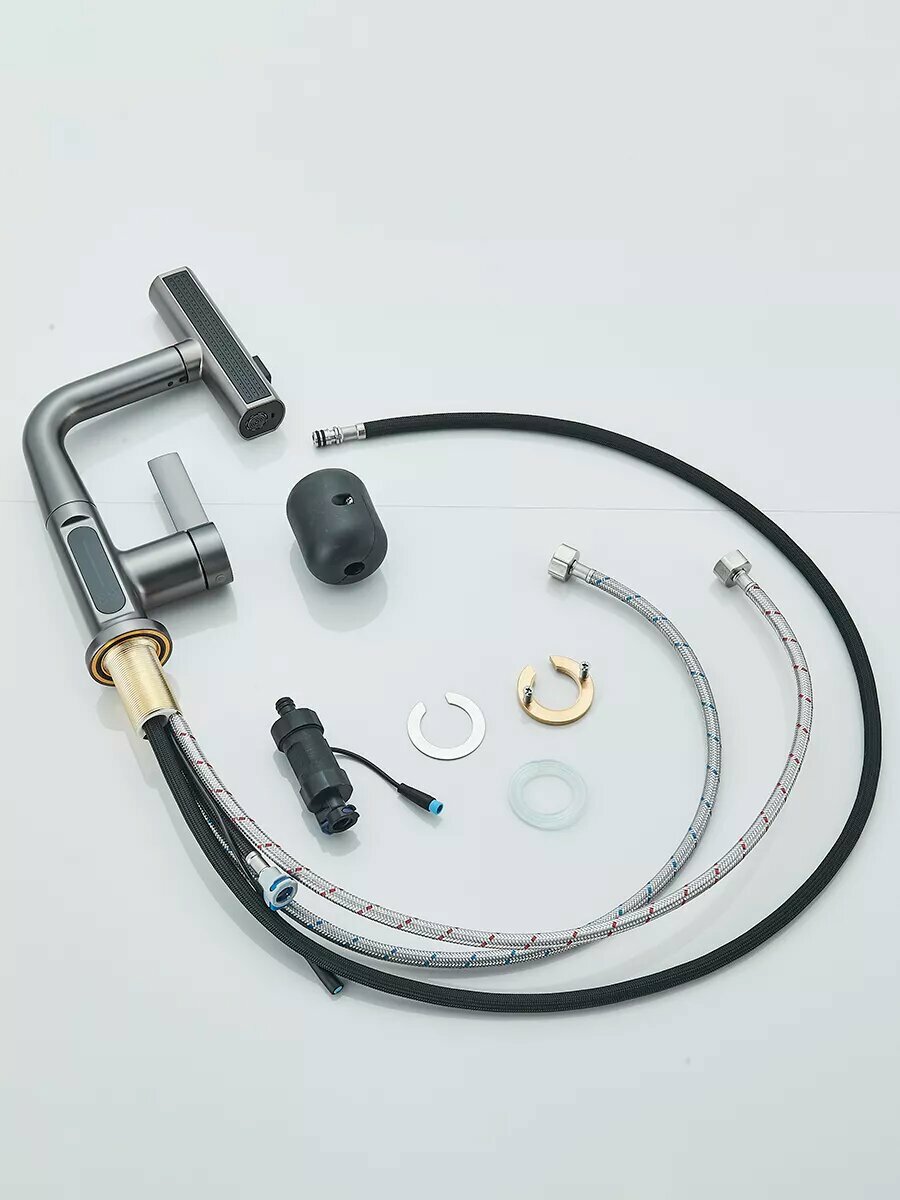 Смеситель для кухни, кран для раковины умный с цифровым дисплеем, выдвижным гибким изливом, 2 вытяжным изливом, 3-х режимная лейка