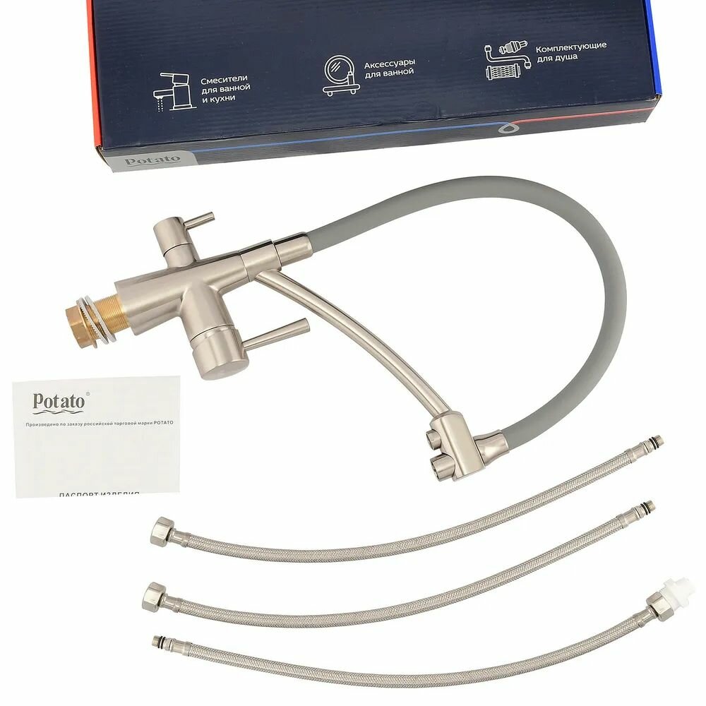 Смеситель для кухни с краном для питьевой воды Potato cерый-cатин P4077-1