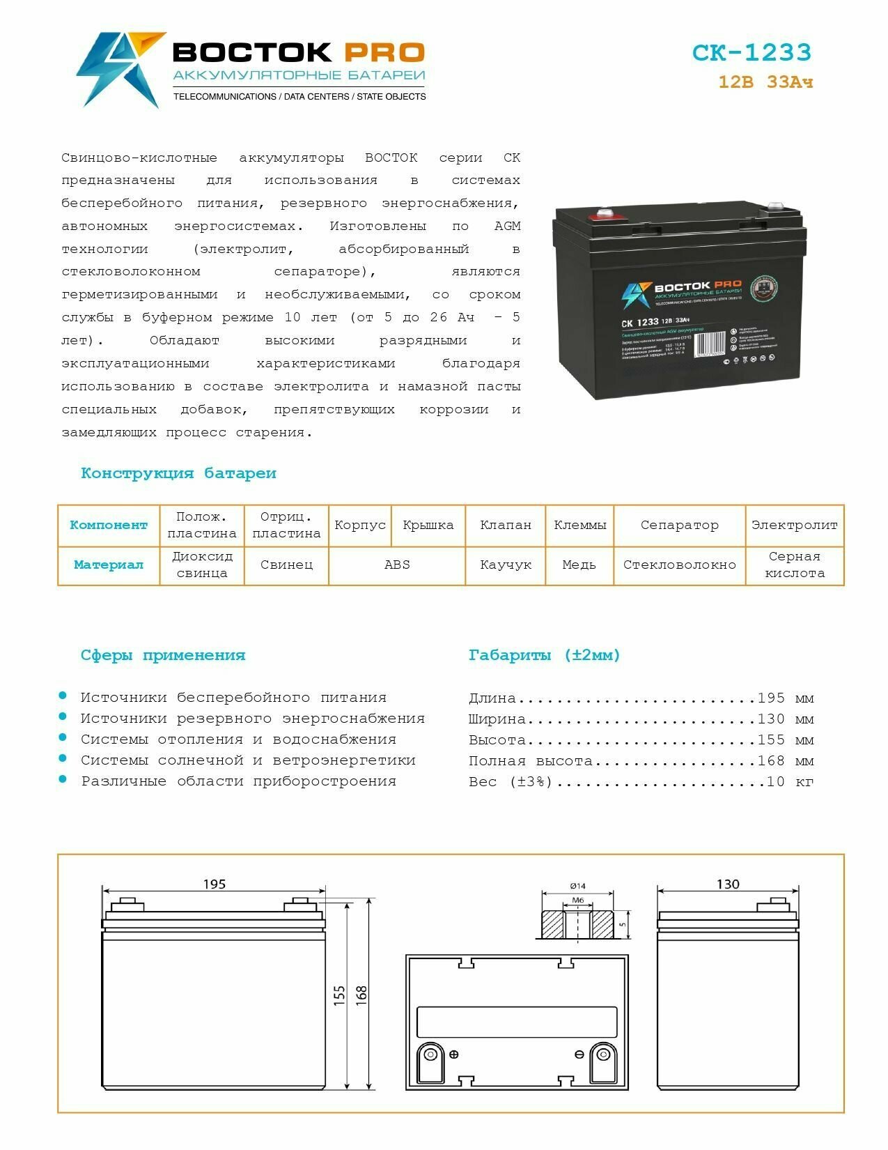 Аккумуляторная батарея Delta (восток СК) СК 1233 12В/33Ач, клемма Болт + гайка Ø 5,5 мм (195х130х155мм (168мм); 10кг) интересное:
