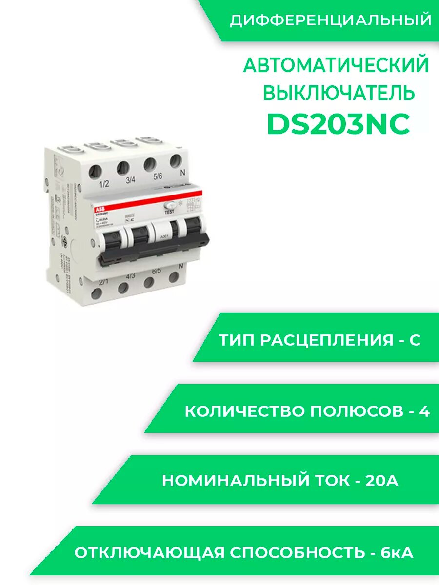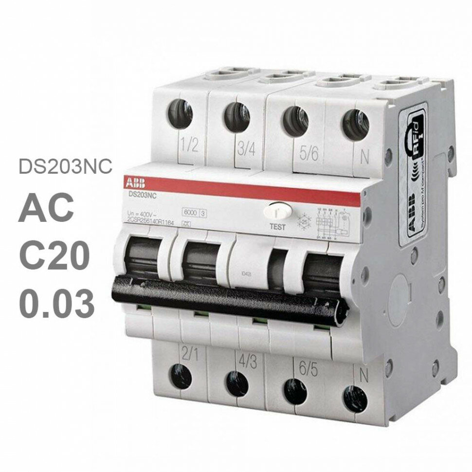 Дифференциальный автомат ABB DS203NC 4П 30 мА C 6 кА AC электромеханический 20 А