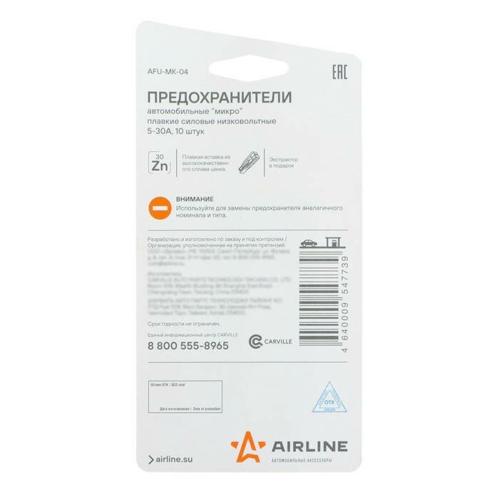 Предохранители "микро" в блистере с экстрактором (10 шт. 5-30А) AFU-MK-04 AIRLINE
