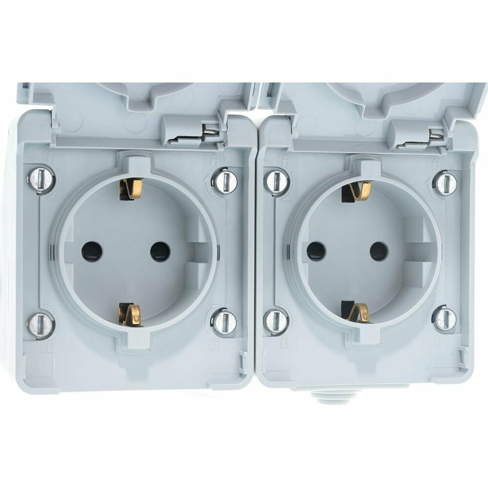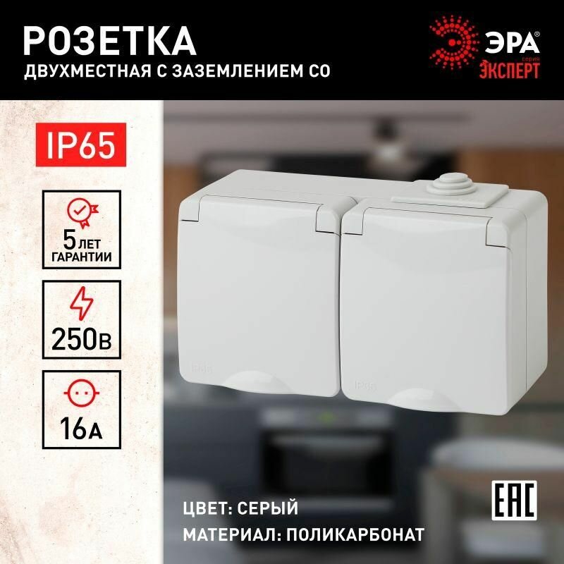 Купить Розетка ЭРА Эксперт горизонтальная двойная с крышками с защитными шторками с заземлением для открытой проводки IP65 серый