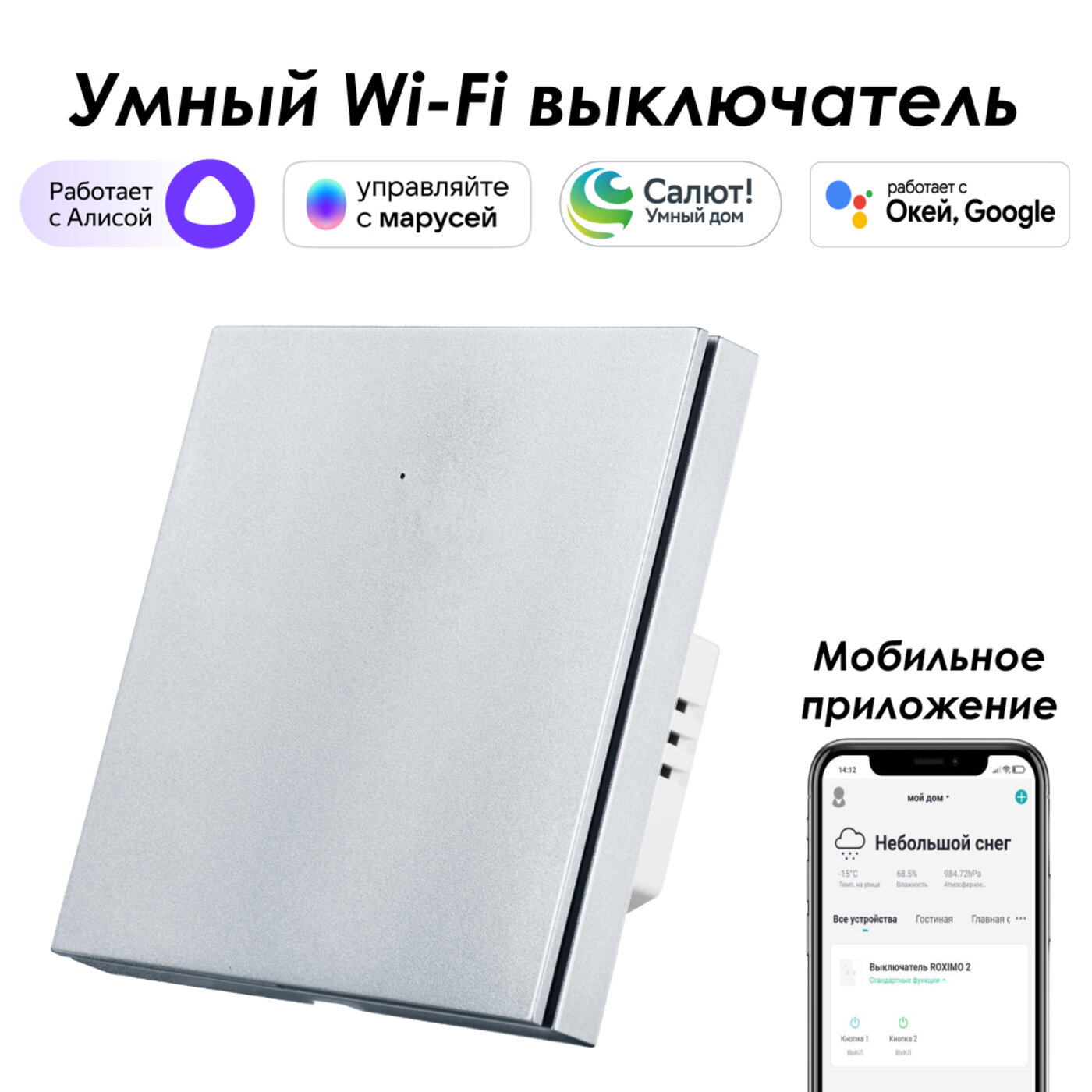 Умный выключатель ROXIMO, двухкнопочный, платиновый, SWBTN01-2P
