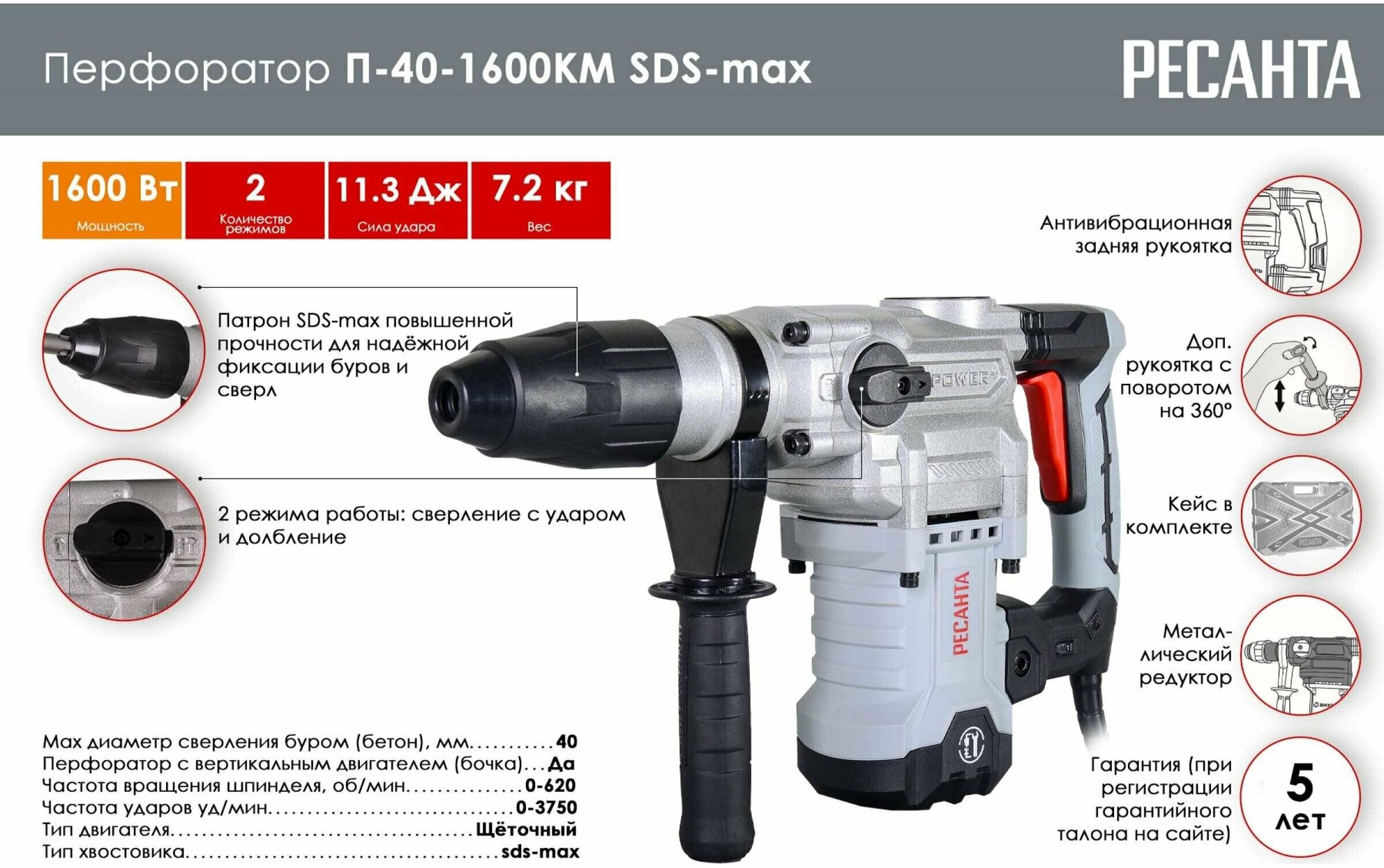 Перфоратор П-40-1600КМ SDS-Max Ресанта 75/3/7 интересное:
