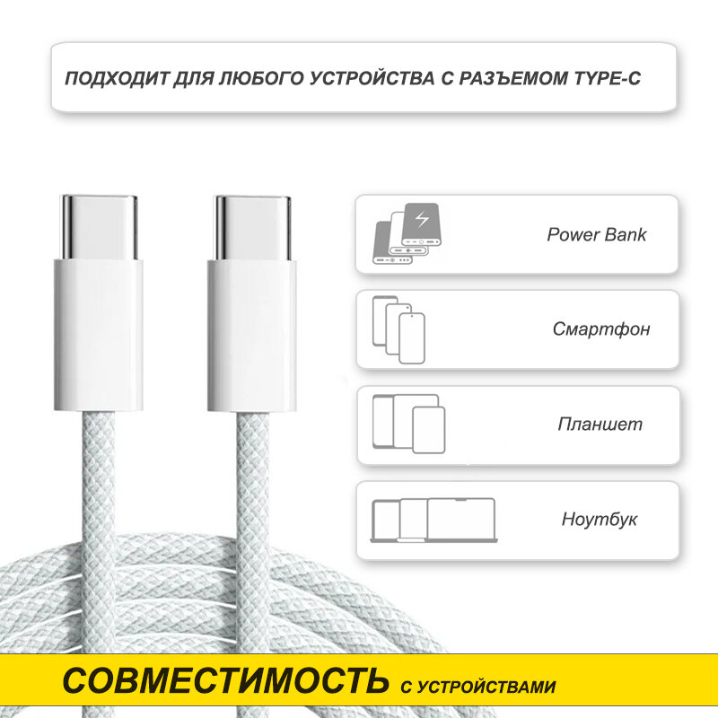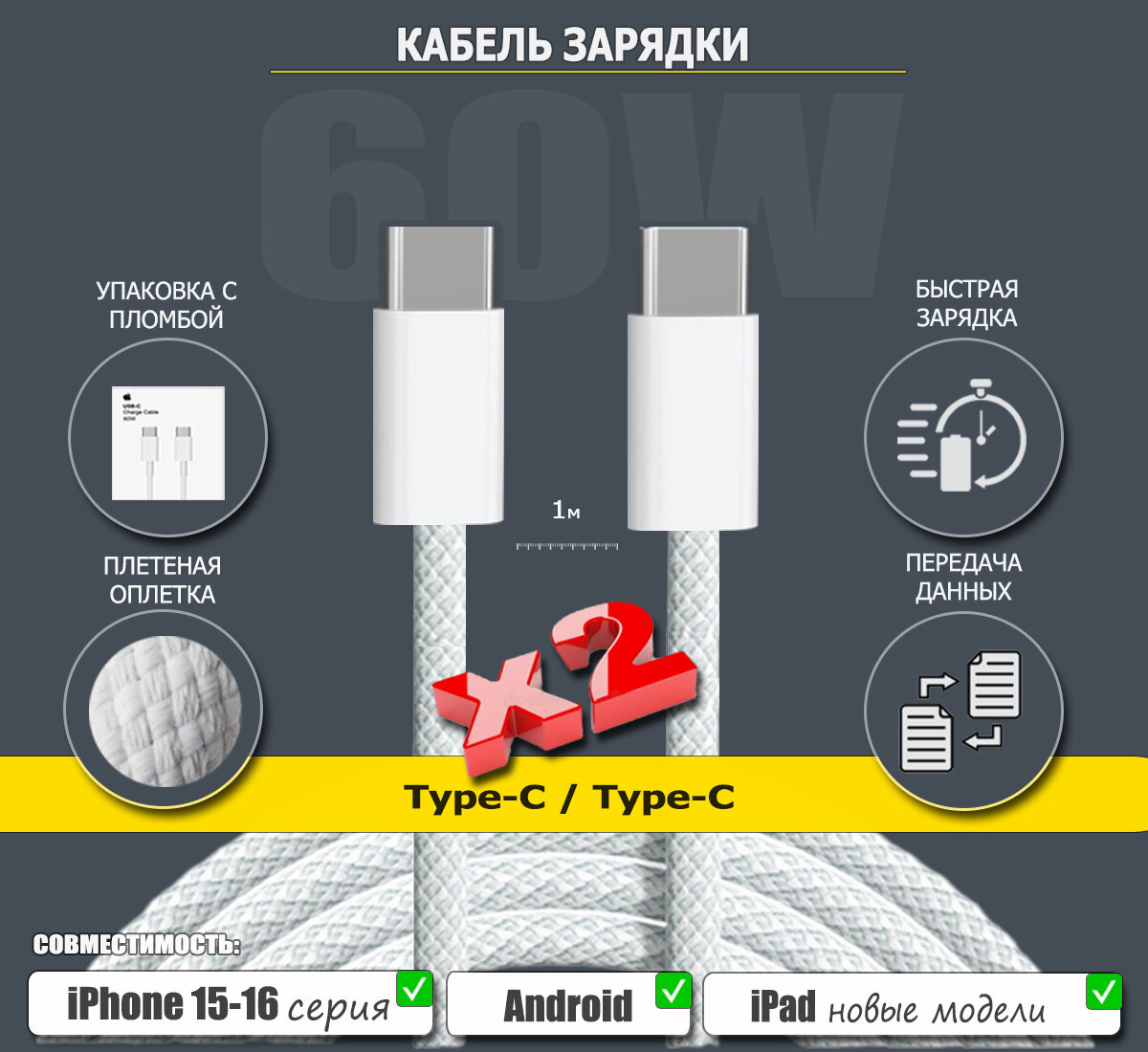 Кабель Type-C - Type-C для iPhone 15-16 Pro, Max, Plus, iPad, Android, 60 Вт, 2шт интересное: