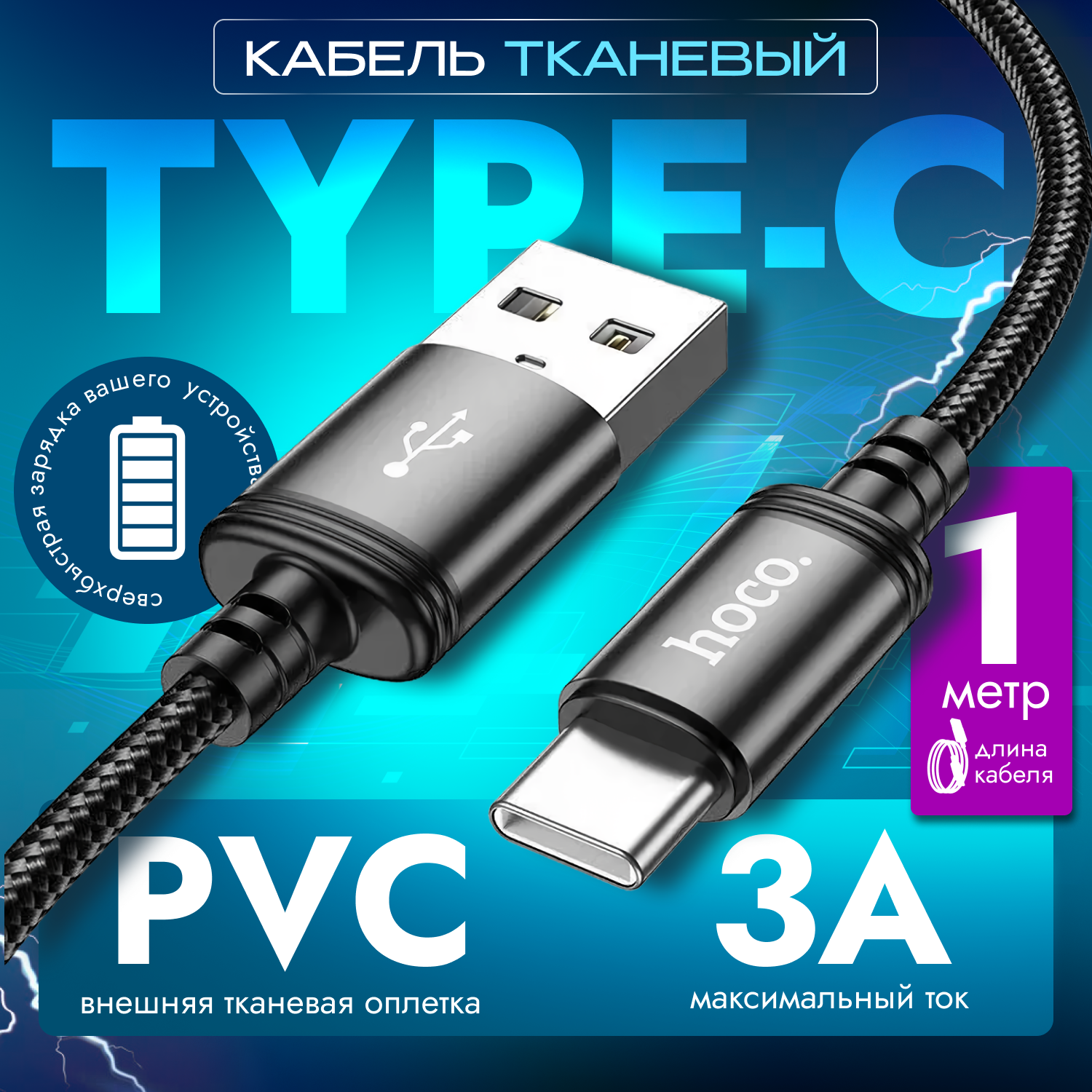 Кабель тканевый USB Type-C 3А для зарядки телефона и передачи данных, быстрая зарядка провод type c, шнур 1 метр, черный