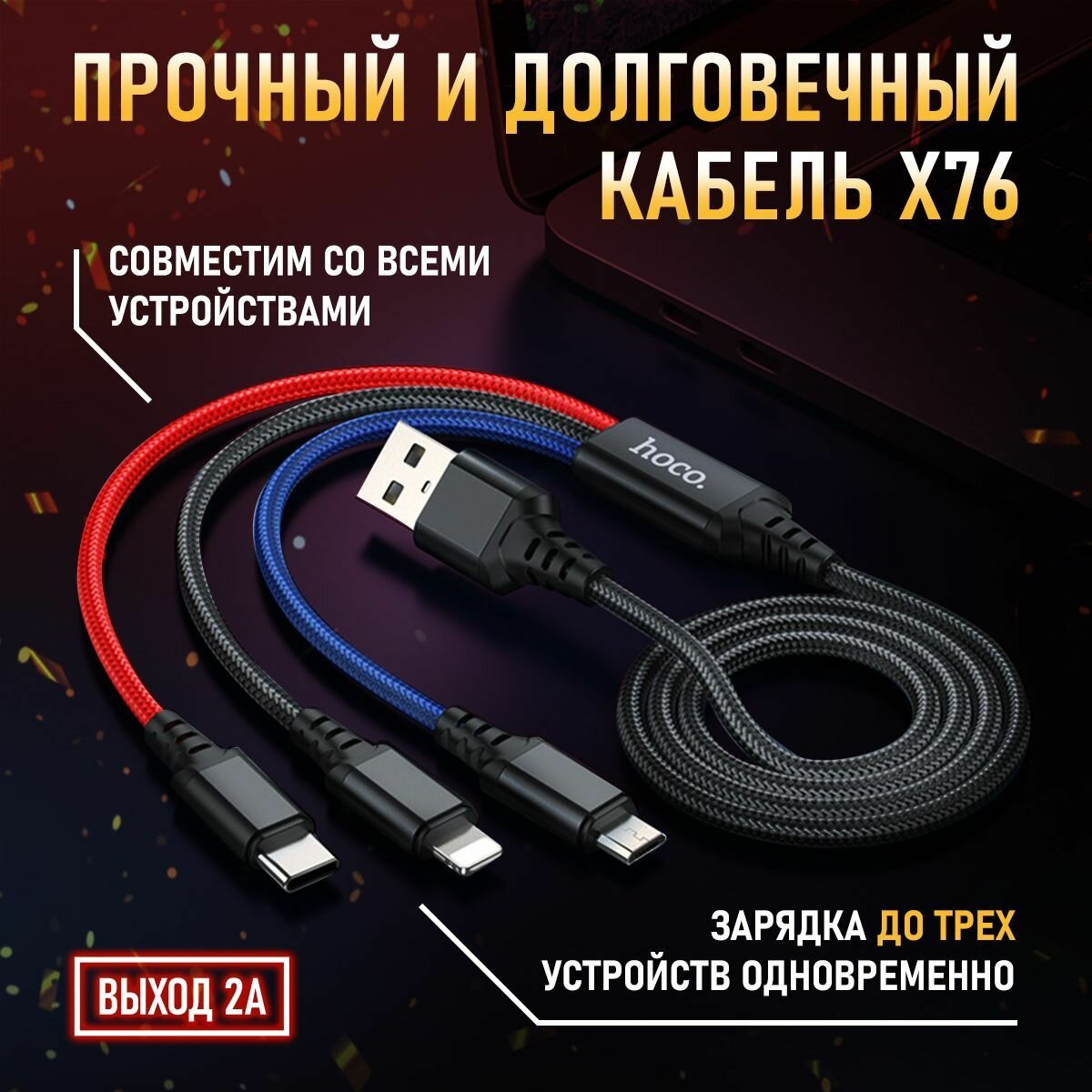 Кабель 3-в-1 Hoco X76 Super зарядный провод/Super charging cable(iP+Type-C+Micro) black/red/blue