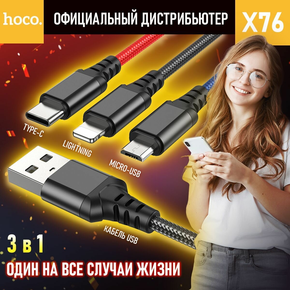 Usb Кабель-зарядка Hoco X76 3в1 Micro/Lightning/Type-C 1м черный