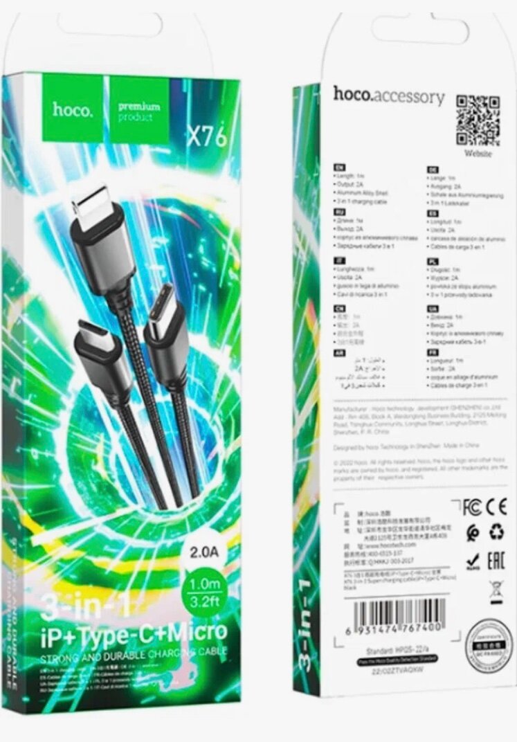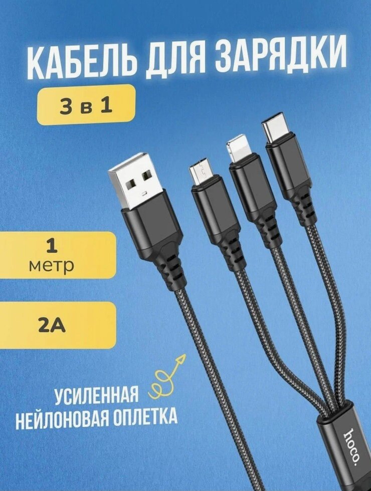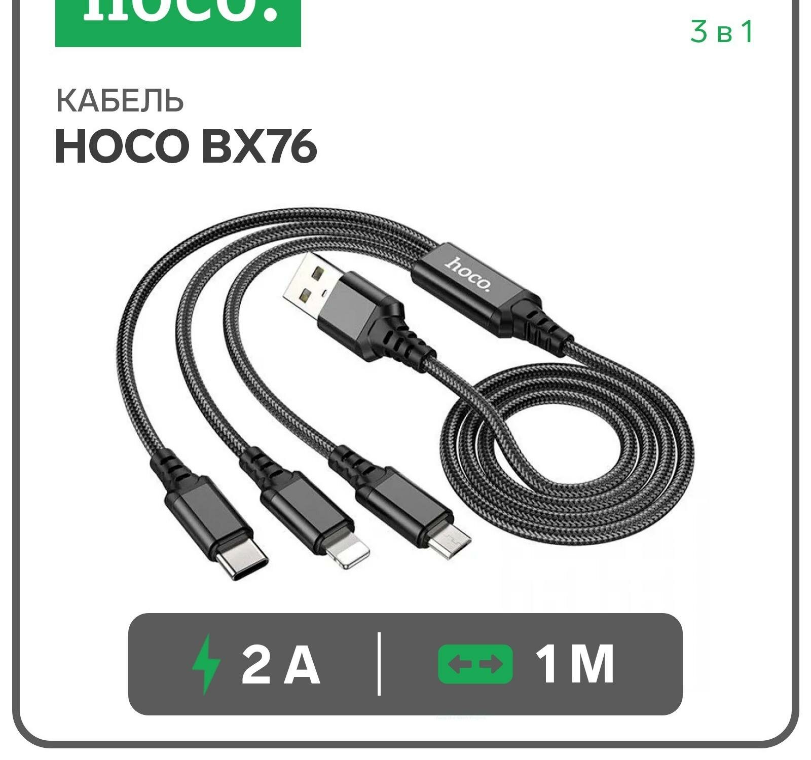 Кабель Hoco 3в1 USB - Lightning/ Type-C/ Micro для Iphone, смартфонов, Hoco X76, чёрный, 1 метр, 2A