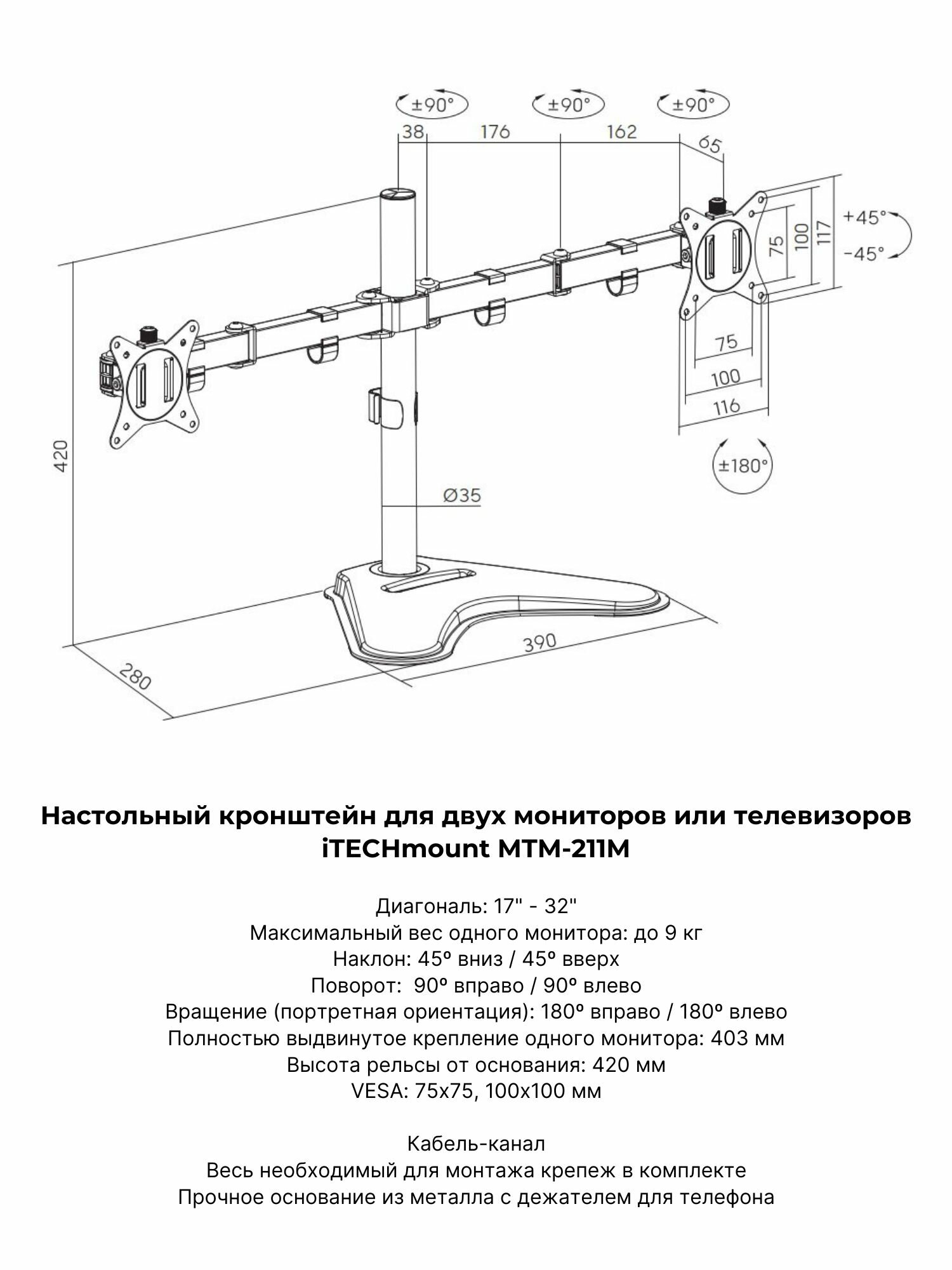 Настольный кронштейн для двух мониторов / телевизоров iTECHmount MTM-211M (17" - 32") интересное: