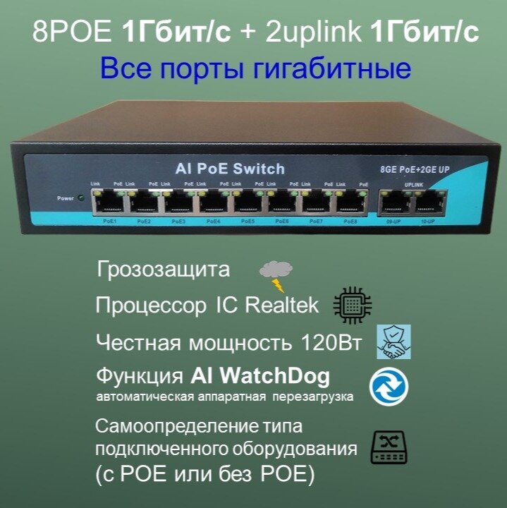 Коммутатор POE (свитч) 8POE 1000Мбит/с +2Uplinк 1000 Мбит/с (гигабит), WatchDog, 120 Ватт, switch IC REALTEK