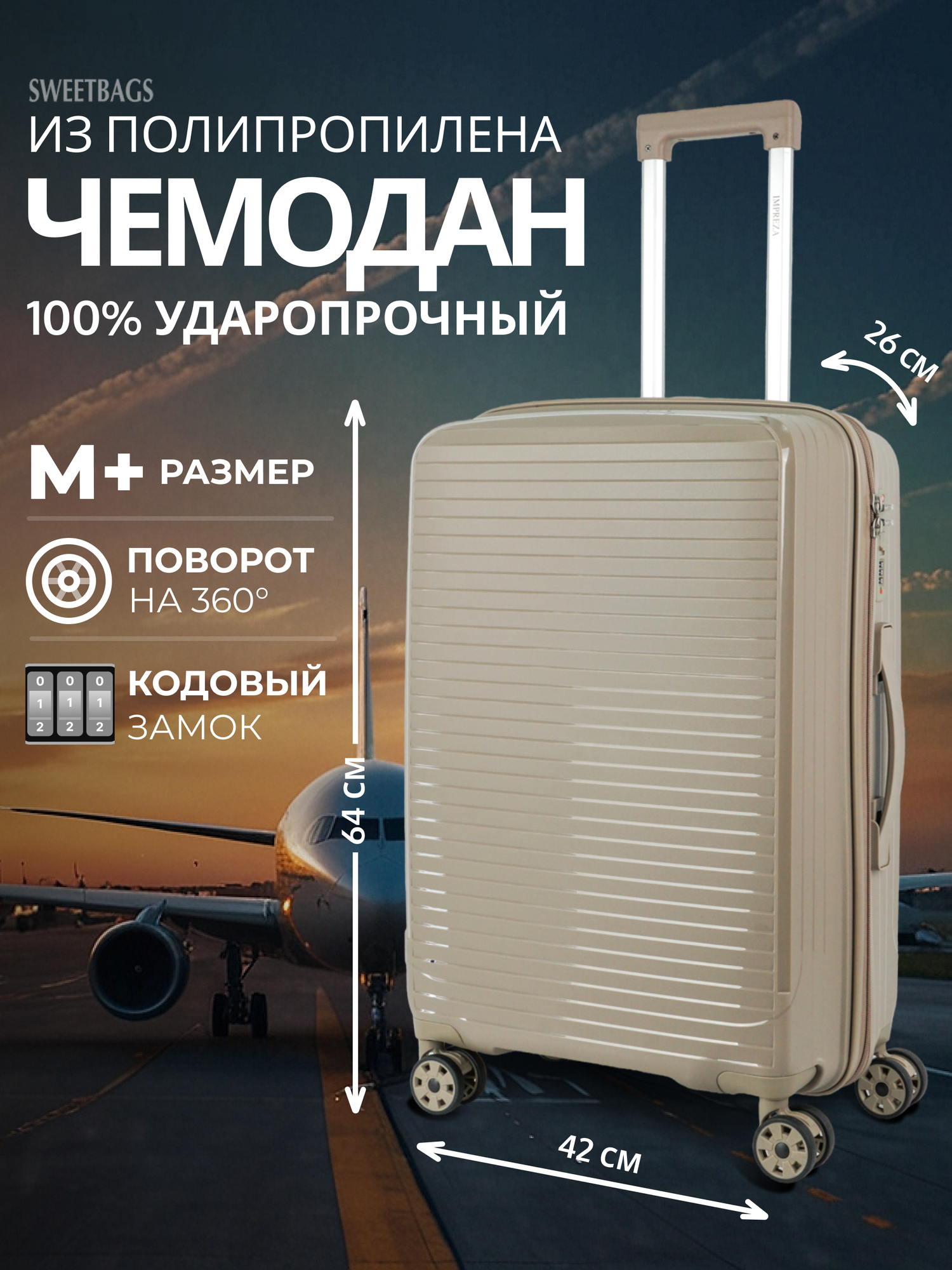 СохранитьЧемодан Sweetbags средний из полипропилена на 4-х колесах с кодовым замком (Shutter) песочный M+ интересное: